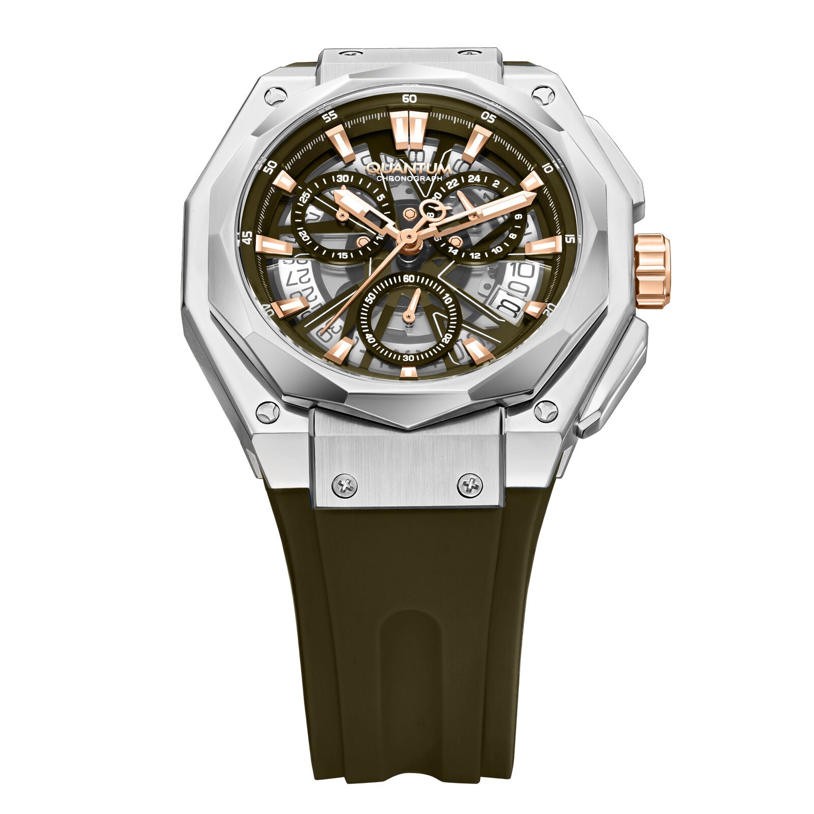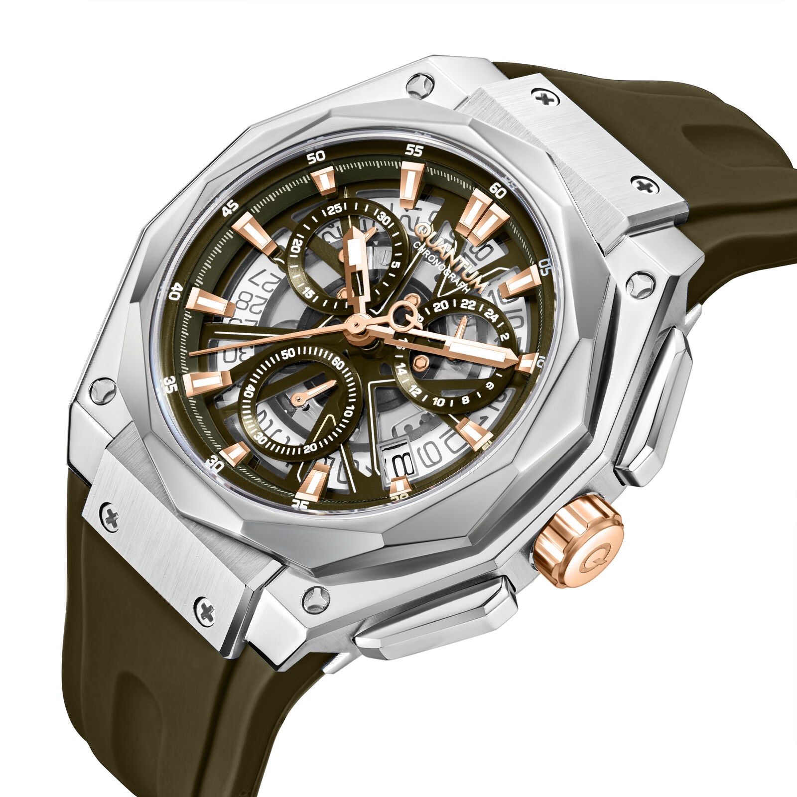 The QUANTUM HUNTER HNG1097.342 represents sophisticated timekeeping engineered for the discerning man. Its distinctive octagonal case geometry delivers a refined aesthetic that transcends conventional watch design, while the understated off-white and light gray palette ensures versatile coordination with any wardrobe.