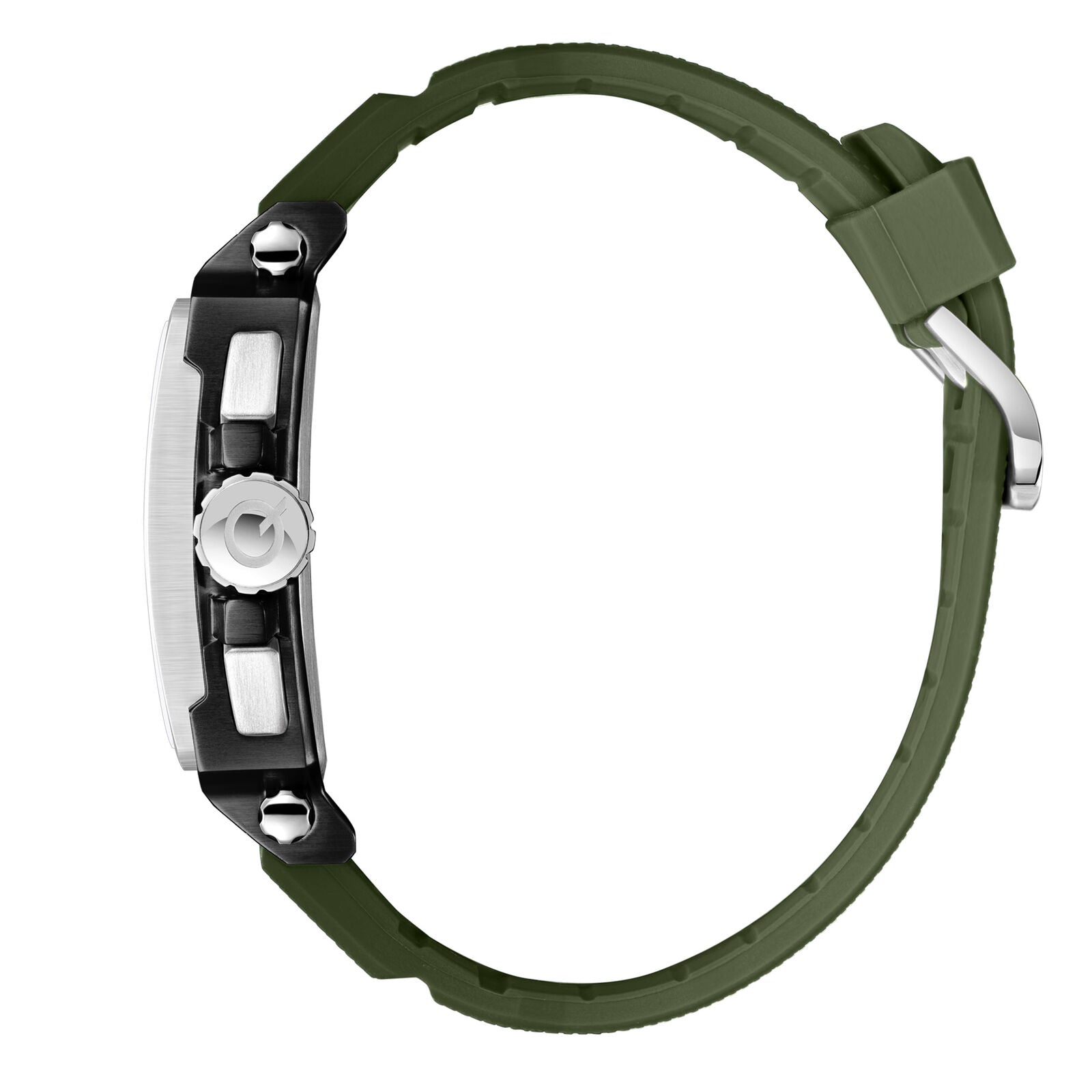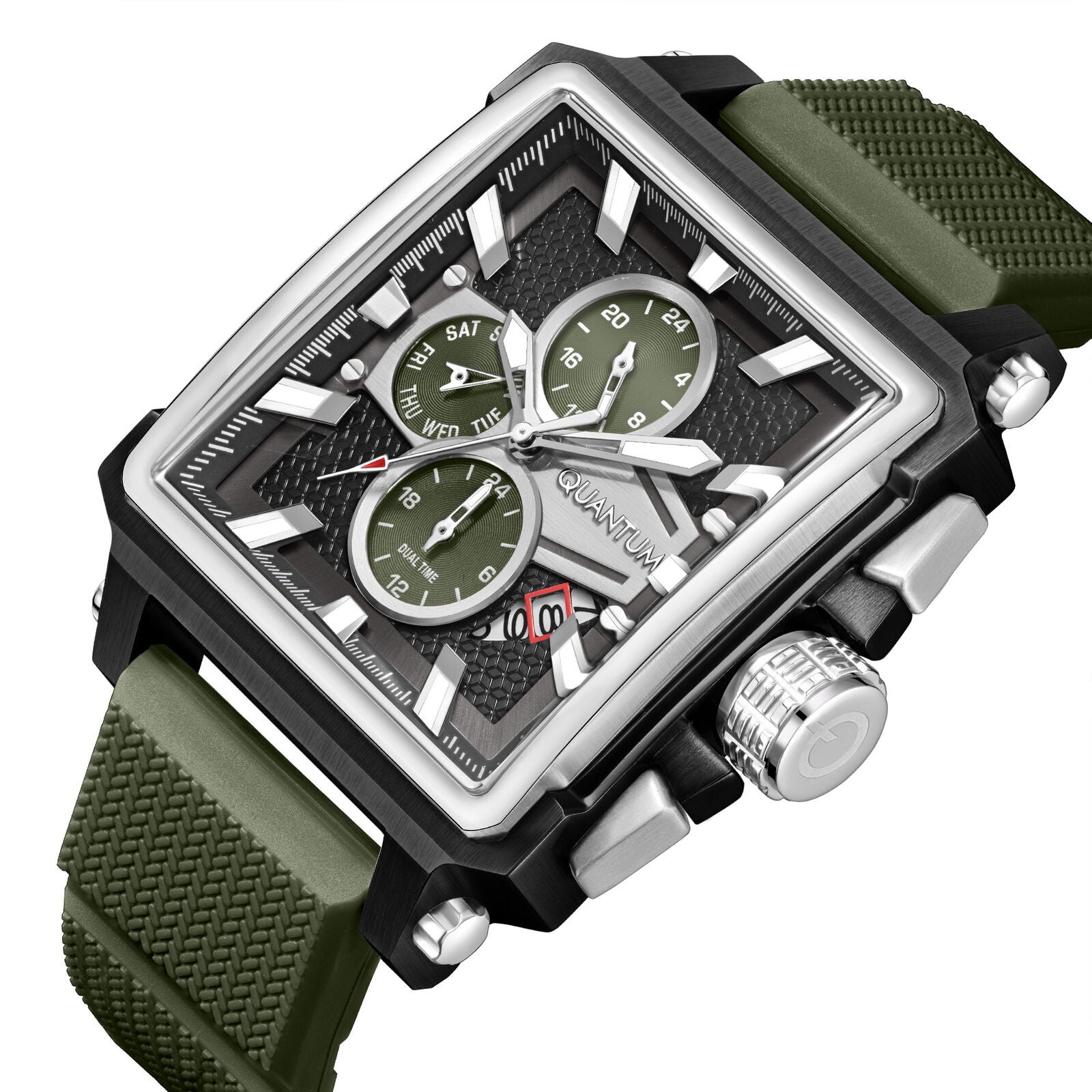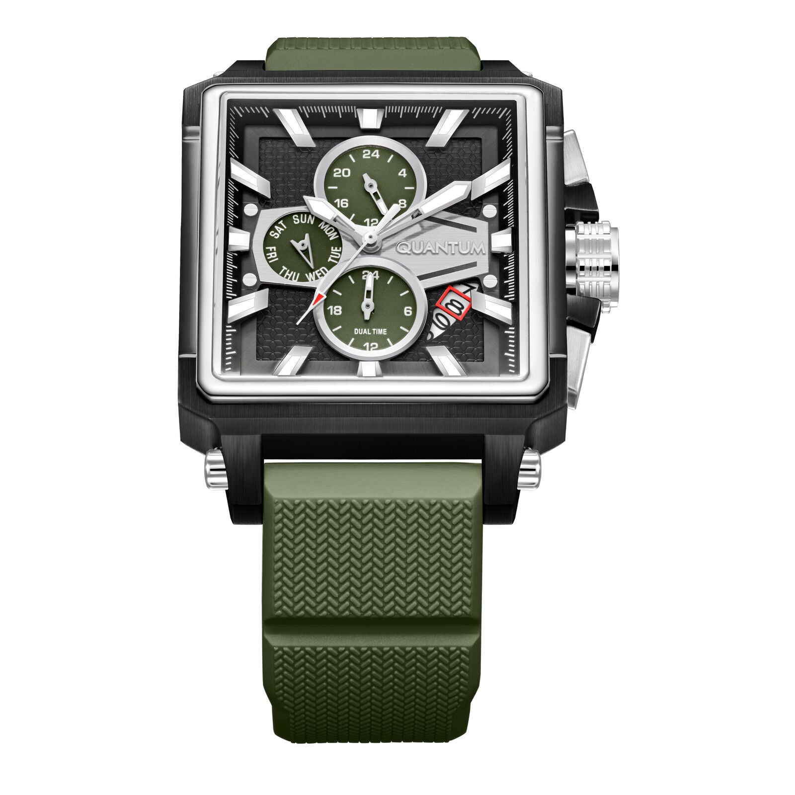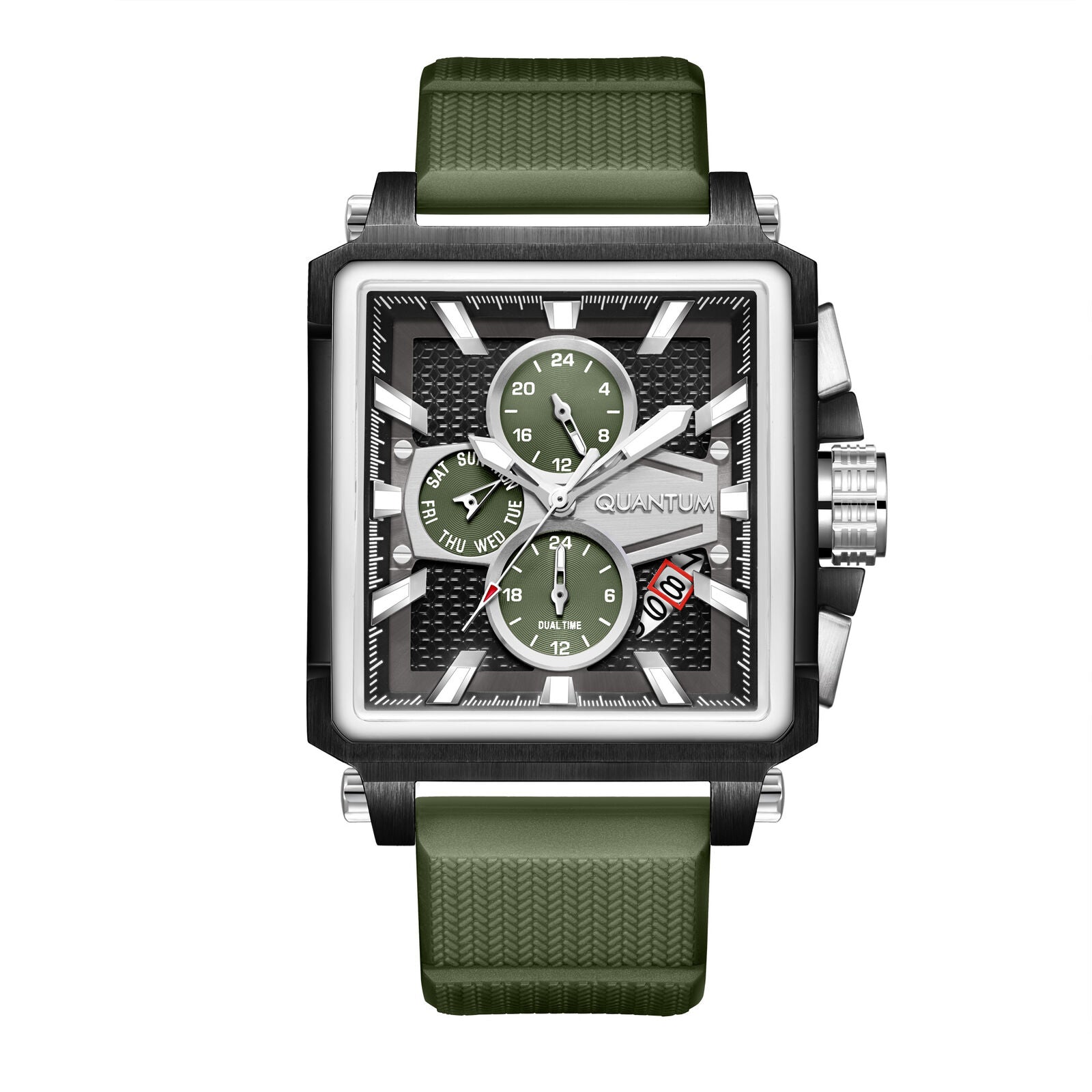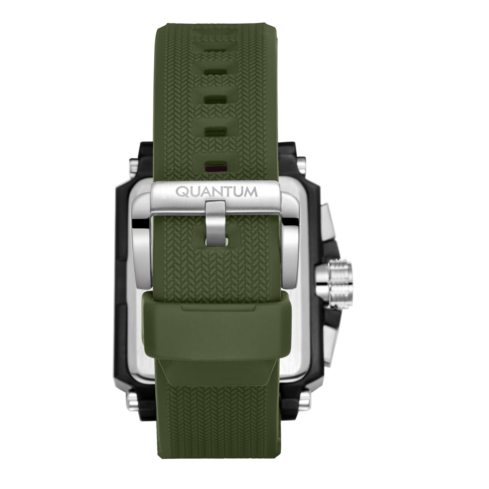 The QUANTUM HUNTER HNG969.375 delivers precision timekeeping with a modern edge. This men's watch features a distinctive green silicone band that combines durability with contemporary style, making it equally suited for active pursuits or everyday wear.