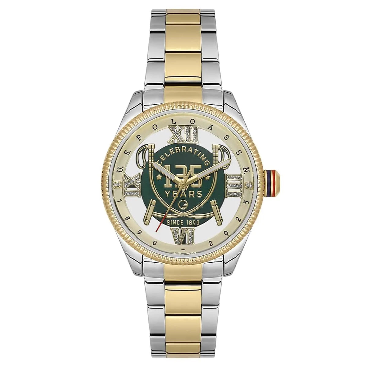 Experience sophistication with the U.S. Polo Assn. 135 Years Anniversary Edition Women’s Watch. Its elegant gold and silver tones perfectly complement the striking green super dial, creating a unique accessory that elevates any outfit. Designed to celebrate a rich heritage, this watch not only tells time but makes a statement. Make this timeless piece yours and showcase your impeccable style every day.