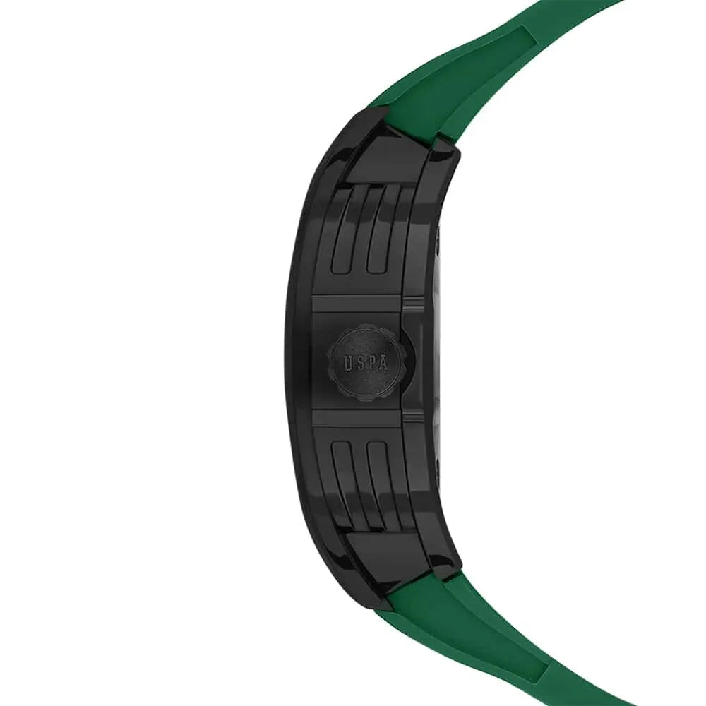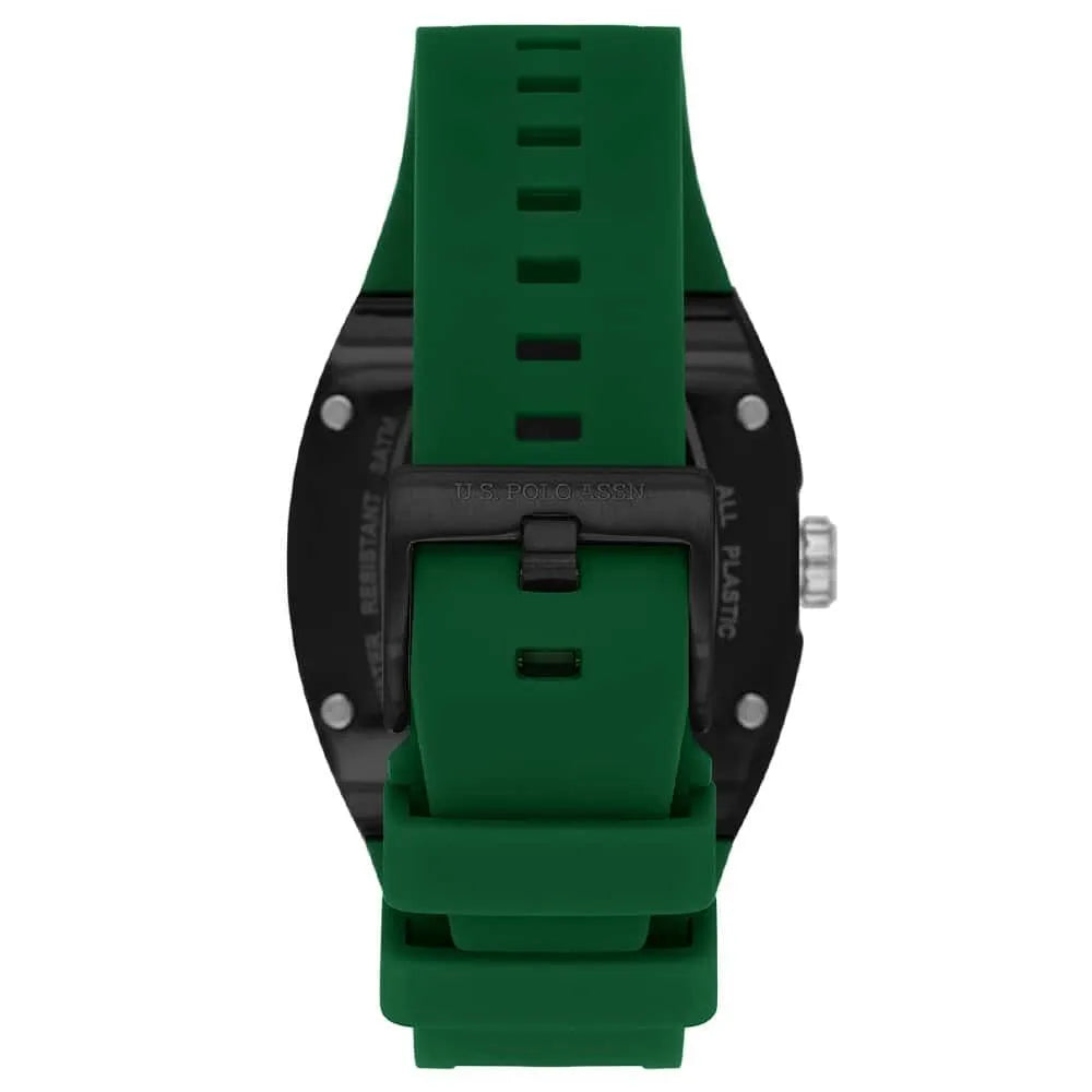 The U.S. Polo Assn. Watch USPA1127-03 combines sporty design with practical features for everyday wear. Its 43mm black tonneau case houses a green analogue dial with chronograph and calendar functions, all powered by reliable quartz technology. The lightweight plastic case and comfortable green silicone strap ensure durability and ease of movement. Water-resistant up to 3 ATM, this watch offers dependable performance with a stylish touch, perfect for men who appreciate functionality and sport-inspired aesthetics.