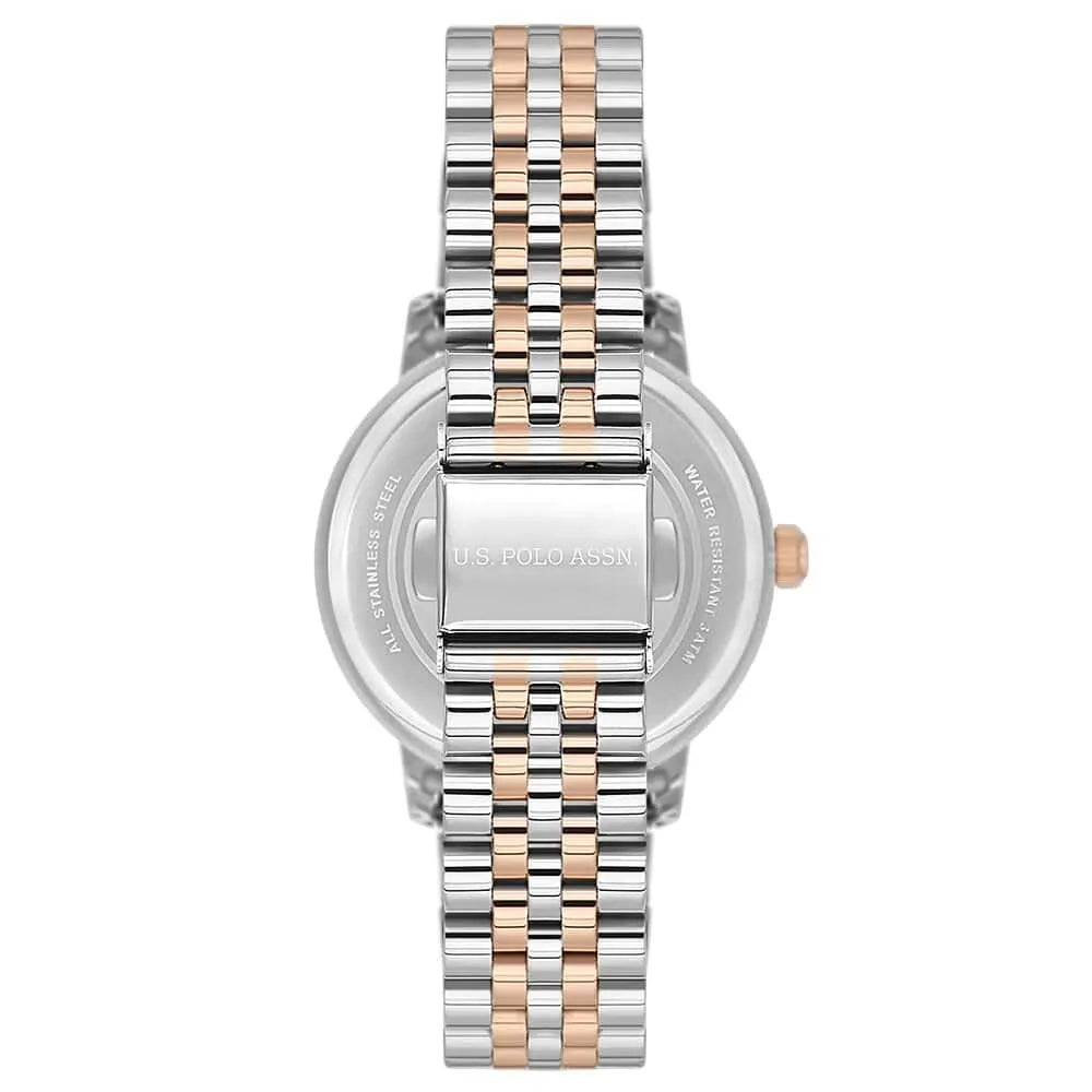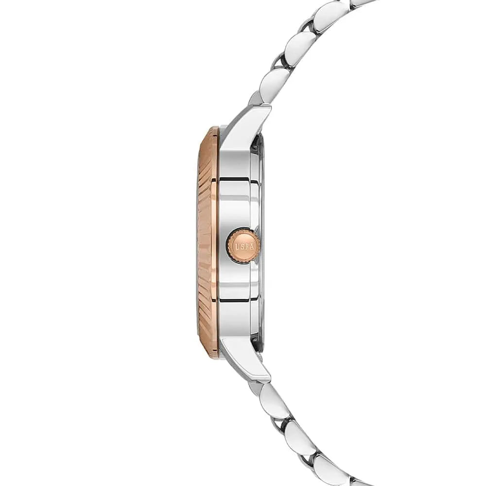 The U.S. Polo Assn. Watch USPA2125-05 is crafted for women who appreciate timeless style and reliable functionality. Featuring a 34mm rose gold round case with mineral glass, this elegant watch includes a metallic gray analogue dial with 24-hour display and calendar functions. The rose gold and metallic gray steel strap offers both durability and a refined look. Waterproof up to 5 ATM, it suits everyday wear confidently. With a lightweight design at 69 grams and backed by a 2-year international warranty, it ensures lasting performance and classic charm.